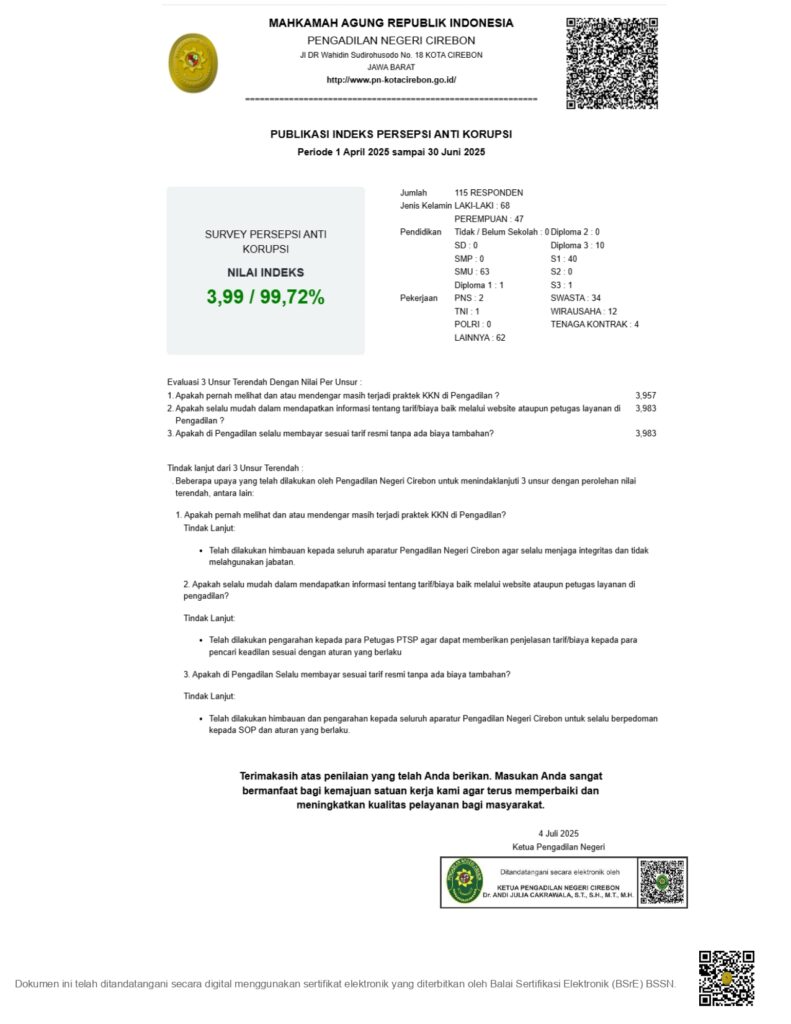 Laporan Monitoring dan Evaluasi Indeks Persepsi Korupsi (IPK) Triwulan II Tahun 2024 Pengadilan Negeri Cirebon Kelas 1B, Klike-Doc