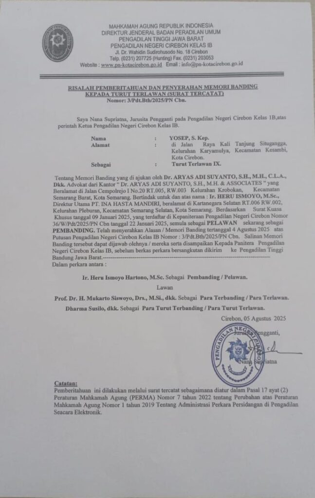 RISALAH PEMBERITAHUAN DAN PENYERAHAN MEMORI BANDING KEPADA TURUT TERLAWAN (SURAT TERCATAT) NOMOR : 3/Pdt.Bth/2025/PN Cbn