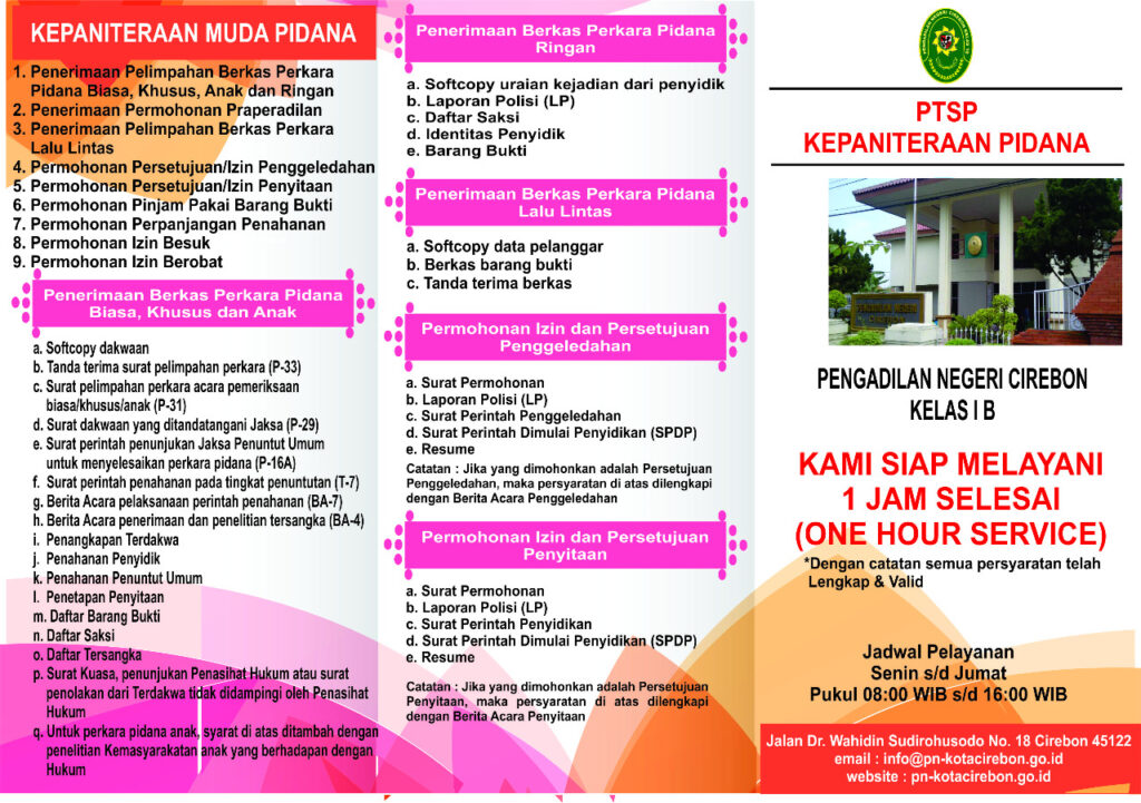 Jl. Dr. Wahidin Sudirohusodo No. 18 Cirebon Telp. (0231) 207725 (Hunting) Fax. (0231) 203053 Website :www.pn-kotacirebon.go.id Email : info@pn-kotacirebon.go.id