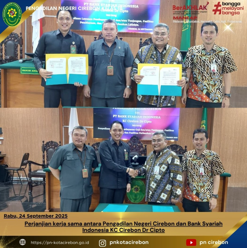 Rabu, 24 September 2025 — Pengadilan Negeri Cirebon secara resmi menjalin kerja sama dengan Bank Syariah Indonesia (BSI) KC Cirebon Dr. Cipto melalui penandatanganan Perjanjian Kerja Sama (PKS) yang berlangsung pada hari ini.