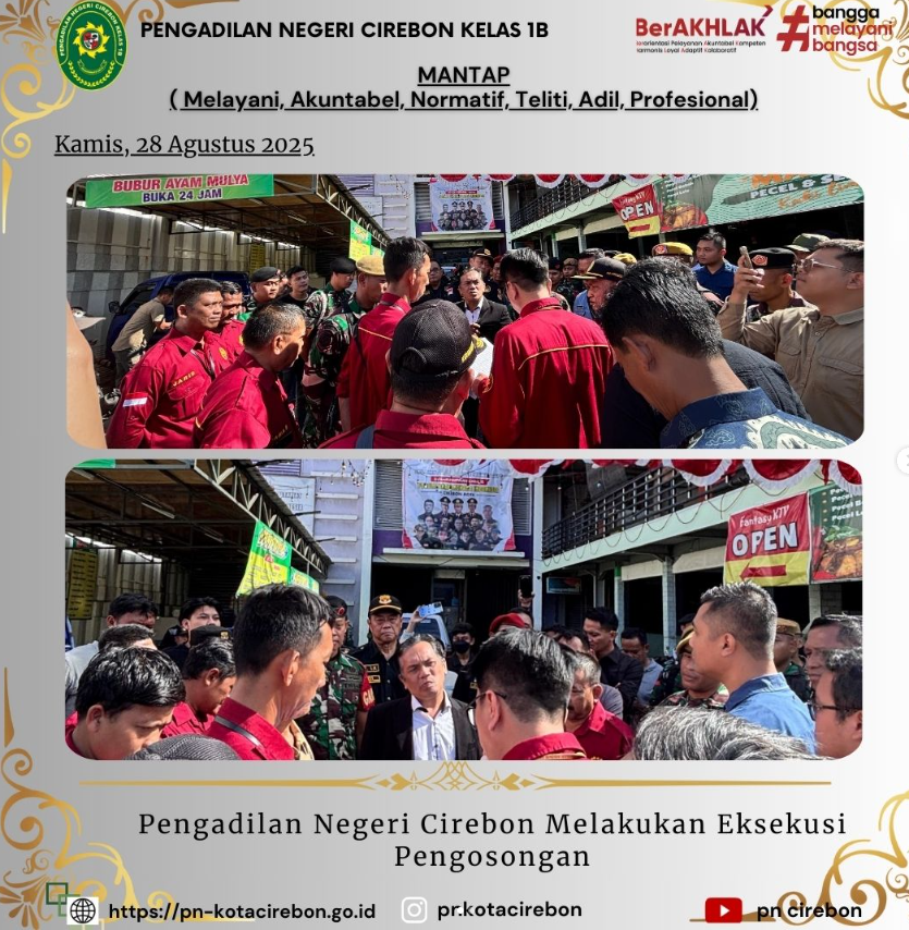 Kamis, 28 Agustus 2025 Pengadilan Negeri Cirebon Kelas I B melaksanakan kegiatan Eksekusi Pengosongan sesuai dengan penetapan pengadilan yang telah berkekuatan hukum tetap. Eksekusi ini merupakan bagian dari pelaksanaan putusan perkara perdata untuk memastikan terpenuhinya hak para pihak sesuai ketentuan hukum.