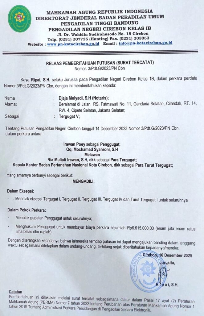 Saya Ripai, S.H. selaku Jurusita pada Pengadilan Negeri Cirebon Kelas 1B, dalam perkara perdata Nomor 3/Pdt.G/2023/PN Cbn, dengan ini memberitahukan kepada: